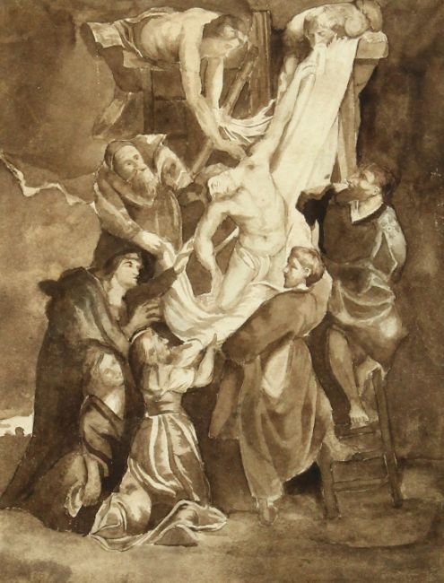 After Rubens, 19th Century School, The deposition of Christ, watercolour, 7.25" x 5.5".