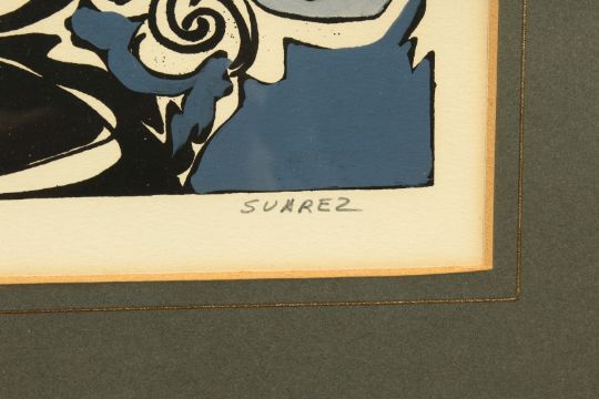 Suarez, Stylized figures, two hand coloured relief prints, signed in pencil, numbered 25/25 and 15/20, 10.5" x 8.25" and 9.5" x 7.5", (2).