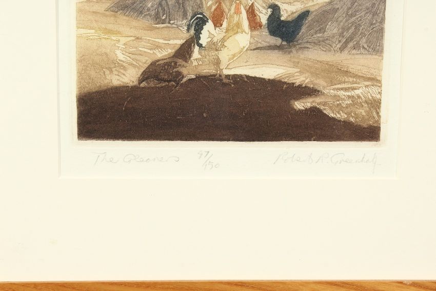 Robert Greenhalf, 'The Gleaners', colour etching, inscribed, signed in pencil and numbered 97/150, 7.25" x 6.5", along with 'Cretan Cockerel', colour etching, inscribed, signed in pencil and numbered 21/150, 7" x 6.25", and 'Bantam hen and chick', colour etching, inscribed, signed in pencil and numbered 8/20, 3.25" x 3.75", (3).
