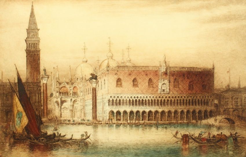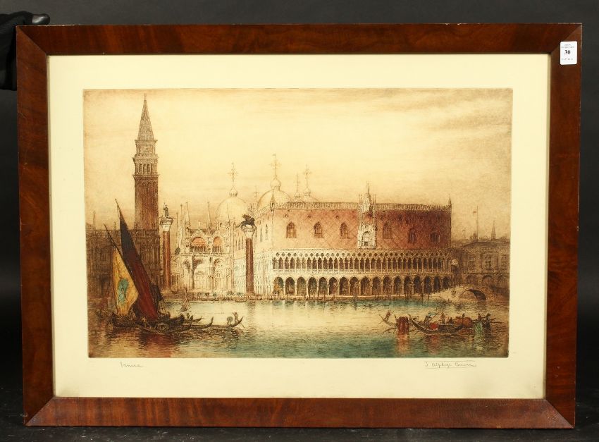 J. Alphage Brewer (1881-1946) British, 'Venice', St. Mark's Basilica and Doge's Palace, colour etching, stamped, 14.75" x 23.25".