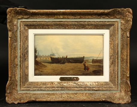Lars Teodor Billing (1817-1892) Swedish, Figures and boats on a shore with buildings beyond, oil on board, signed with initials and inscribed verso, 6.5" x 10.5".