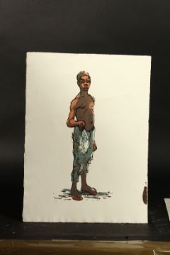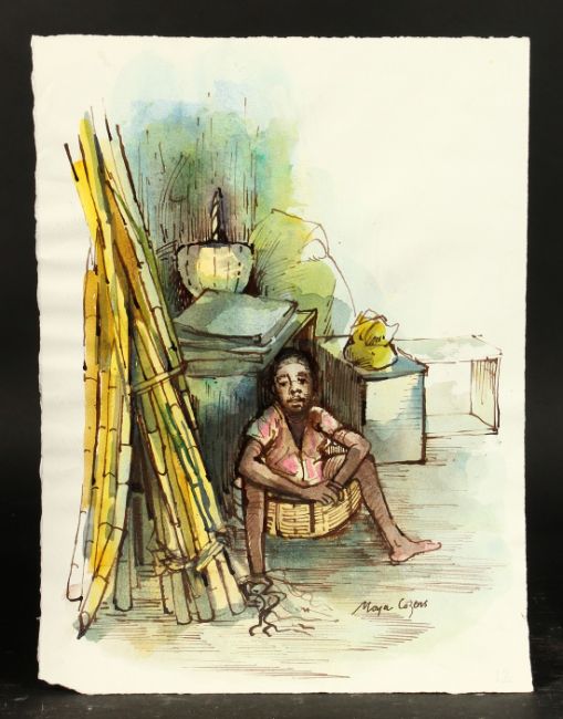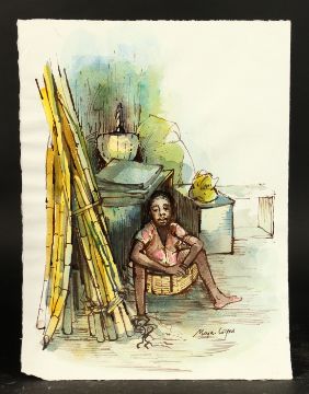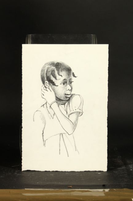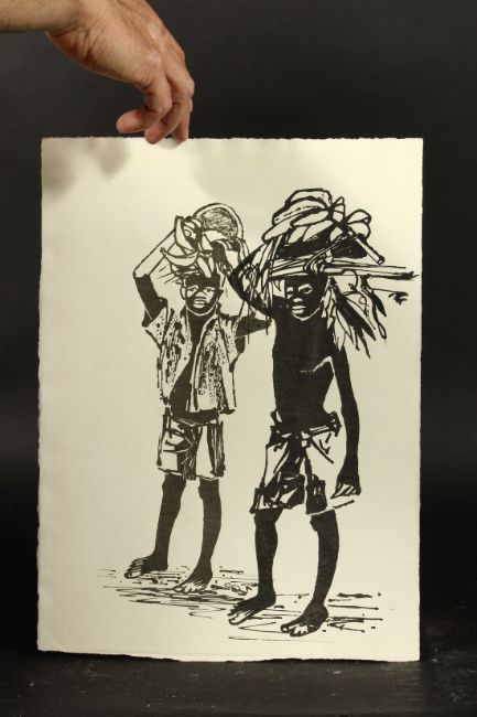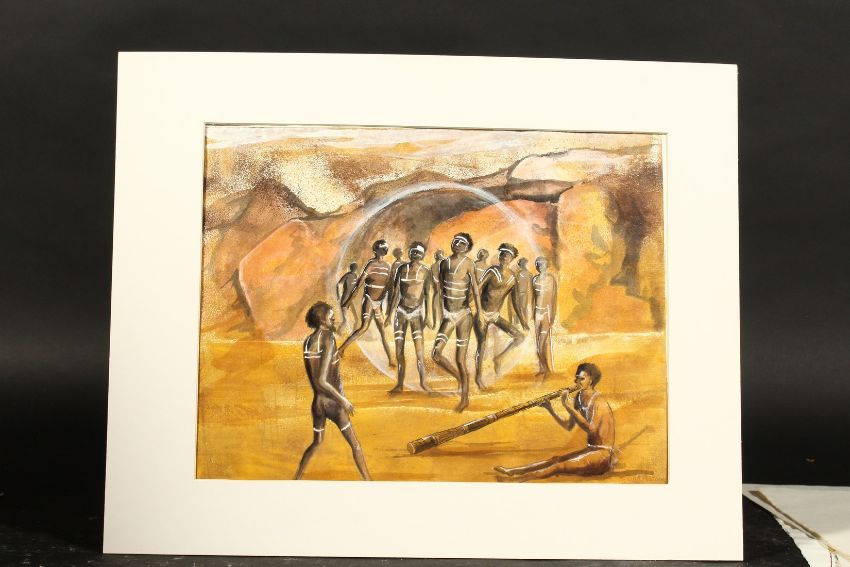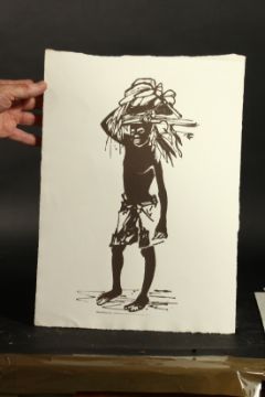 Moya Cozens, (1920-1990) British, 'Boy in a basket', sepia, ink and watercolour, 15" x 11", along with two pencil drawings by Cozens and a small collection of prints and a mixed media of an Australian Aboriginal dance, signed S. Gabriel, (all unframed) (qty).