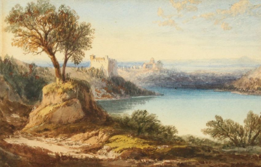 Follower of William Callow (1812-1908) Lake Albano with the Castel Gandolfo in the background, watercolour, 3.5" x 5.25".