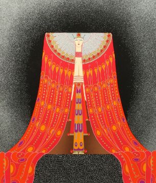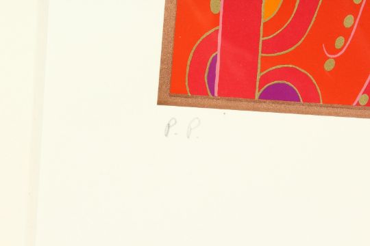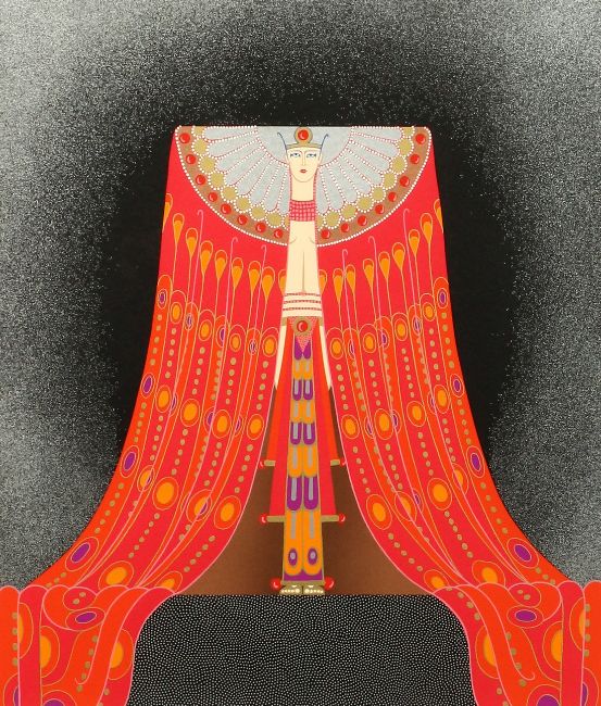 Erte (Romain de Tirtoff), A stylised female figure in an elaborate red headdress, stencil, inscribed P.P. in pencil and bearing a signature, 21.5" x 16.5".