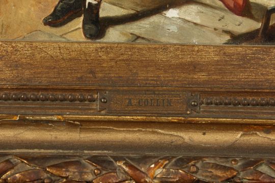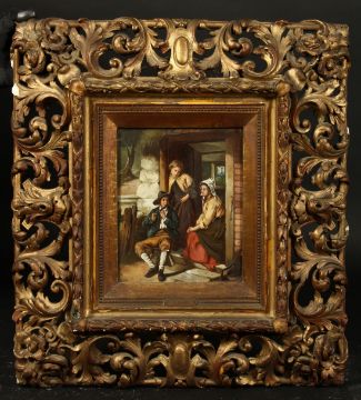 Andre Collin (1862-1930) French, Figures gathered outside a cottage, oil on panel, 9" x 7.25", in a fine gilt composition frame.