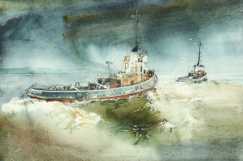 David Morris, Two Hull fishing boats under way, watercolour, signed, 13.25" x 19.75".