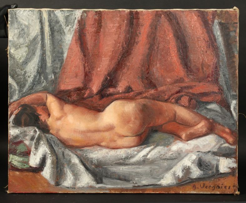 Early 20th Century Continental School, A recumbent female nude, oil on canvas, signed A. Virgnier? 25.5" x 32", (unframed).