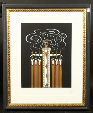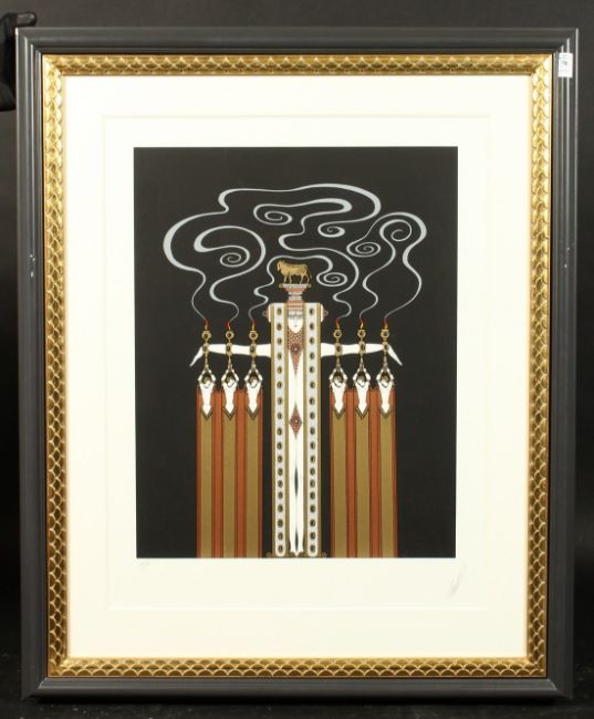 Erte (Romain de Tirtoff), A stylised female figure in an elaborate costume on a black background, stencil, inscribed P.P. in pencil and bearing a signature, 21.5" x 16.5".