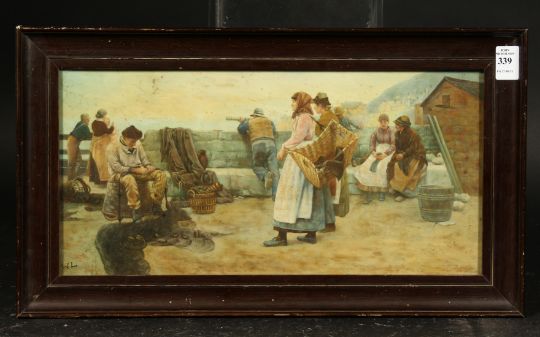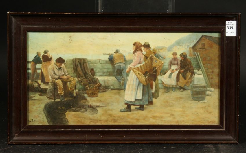 After Walter Langley, 'In a Cornish Fishing Village', oil on canvas, bears initials, 8" x 16".