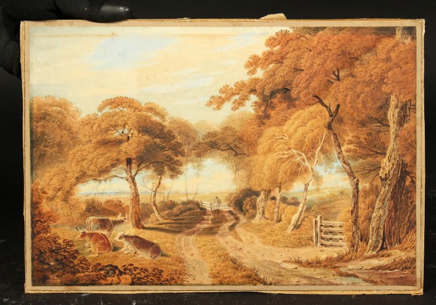 Thomas Pyne, RI RBA (1843-1935) British, Cattle alongside a road, watercolour, 8.5" x 12.6".
