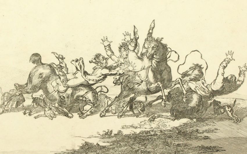James Gillray, (1756-1815) British, A set of four hunting scenes, black and white etchings, 12" x 15.75", (4).