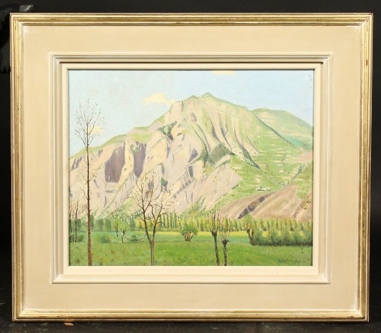 Robert Morson Hughes (1873-1953) British, Alpine meadows with a rocky escarpment beyond, oil on panel, signed, 10" x 14".