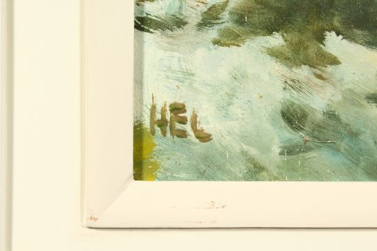 H.E. Lewis (20th Century) British, 'Snow Scene', A winter landscape at dusk, oil on board, signed with initials, 15" x 18".