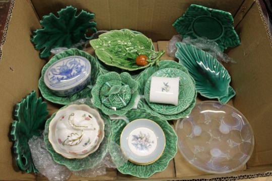 Cabbage leaf and other decorative china, a French moulded and opaque glass dish, large jug etc.