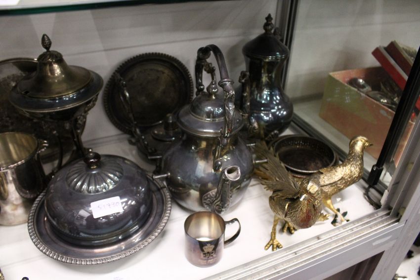 A quantity of plated ware to include a kettle on stand a coffee pot etc.
