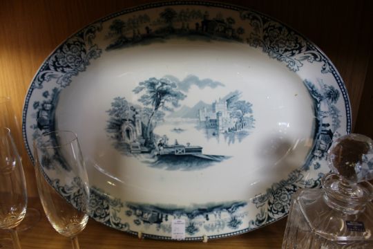 A large meat plate, a cut glass decanter, champagne flutes and a hip flask.