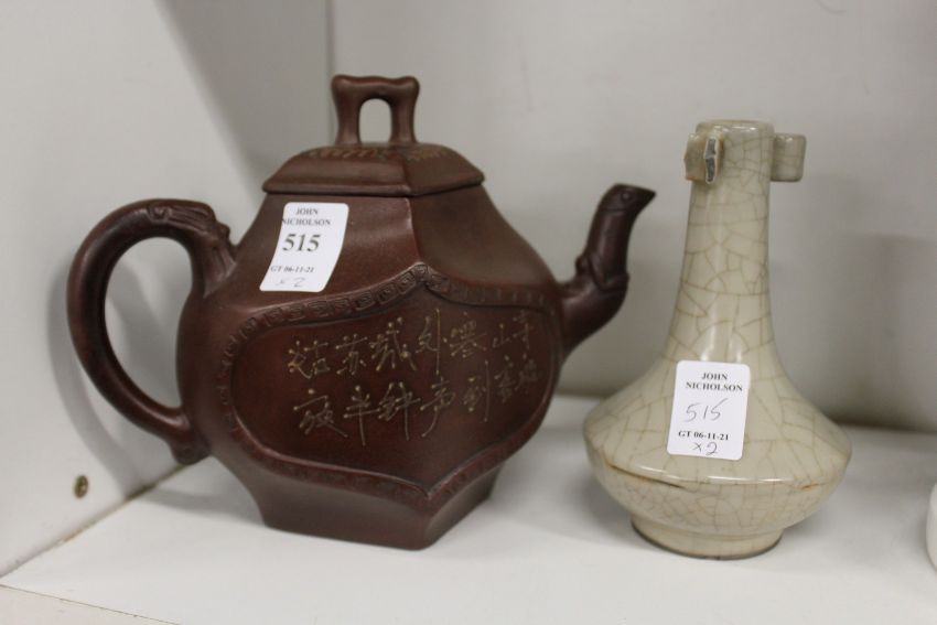 A Chinese Yixing teapot and a small bottle vase (AF).