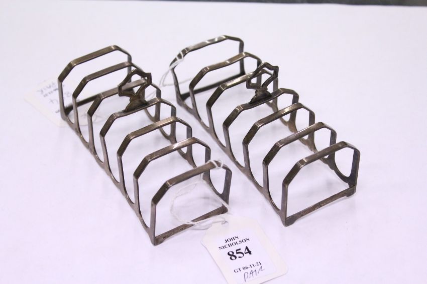 A small pair of silver six division toast racks.