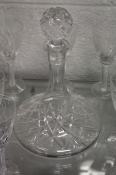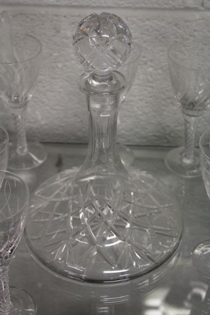 A suite of Stuart glassware with etched decoration and air twist stems together with a similar decanter.