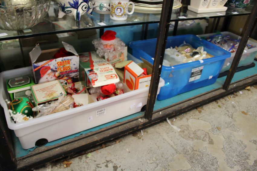 Three large boxes of Christmas decorations.