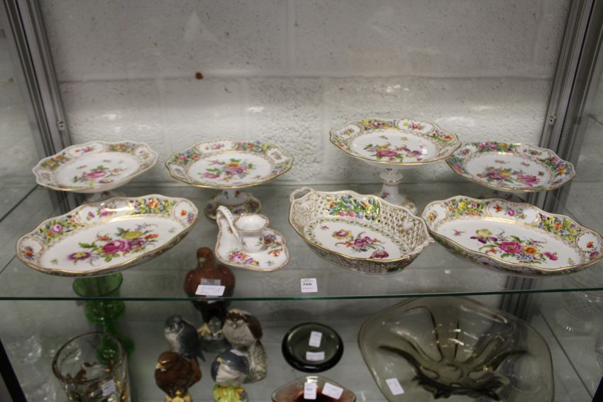 A good collection of Dresden floral decorated porcelain to include comports, dishes and a chamber stick.