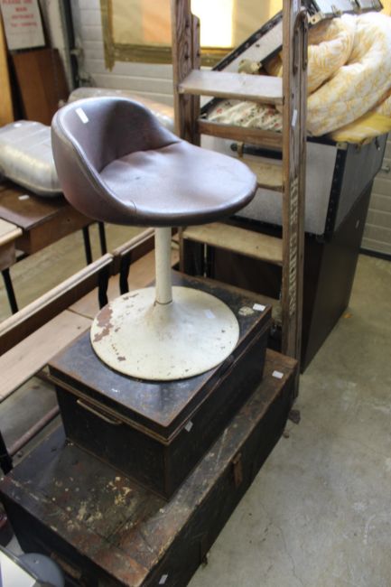An old pair of step ladders, a small swivel chair and two trunks.