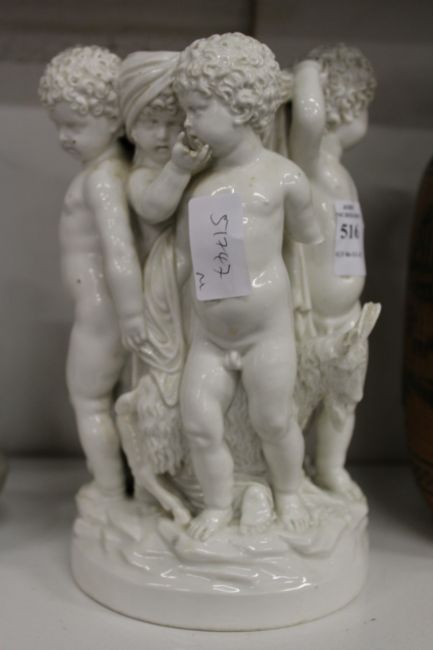 A 19th century white porcelain candelabra base modelled as children and a goat by a tree stump.