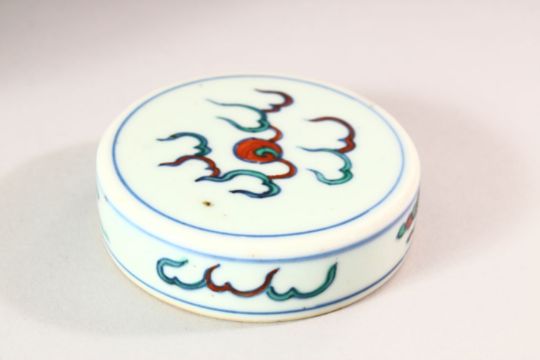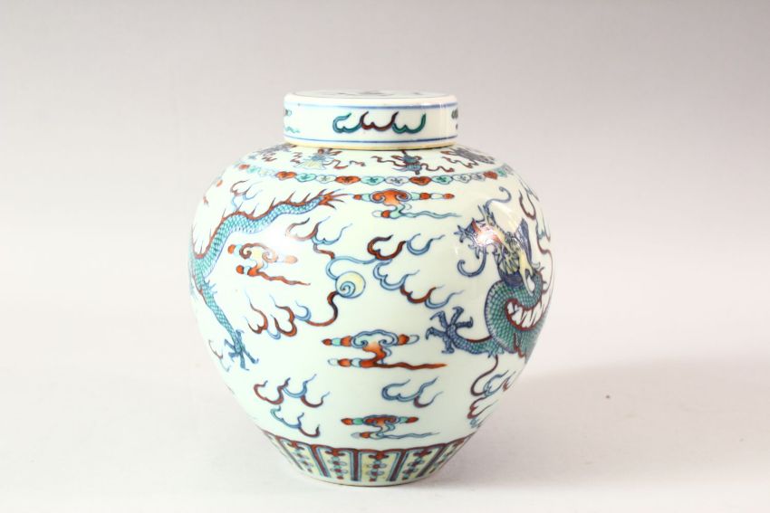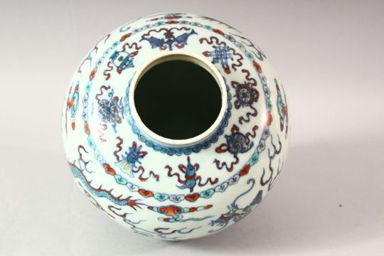 A GOOD 19TH CENTURY CHINESE DOUCAI DECORATED PORCELAIN GINGER JAR & COVER - decorated with scenes of dragons chasing the pearl, amongst clouds and lingzhi style clouds, further decorated with borders of precious / auspicious objects, the base with a six character Qianlong mark, with a repaired neck. 20cm high.