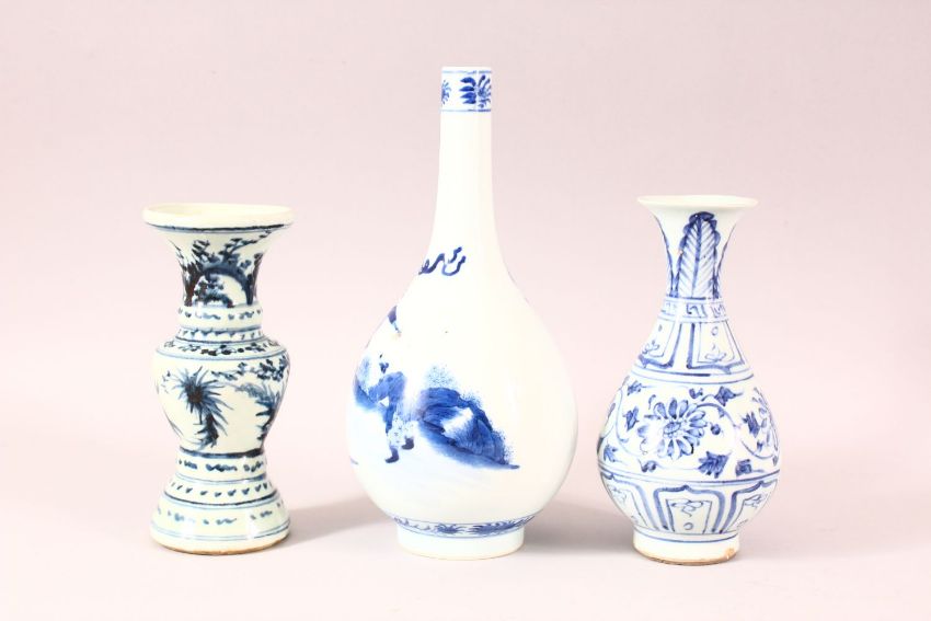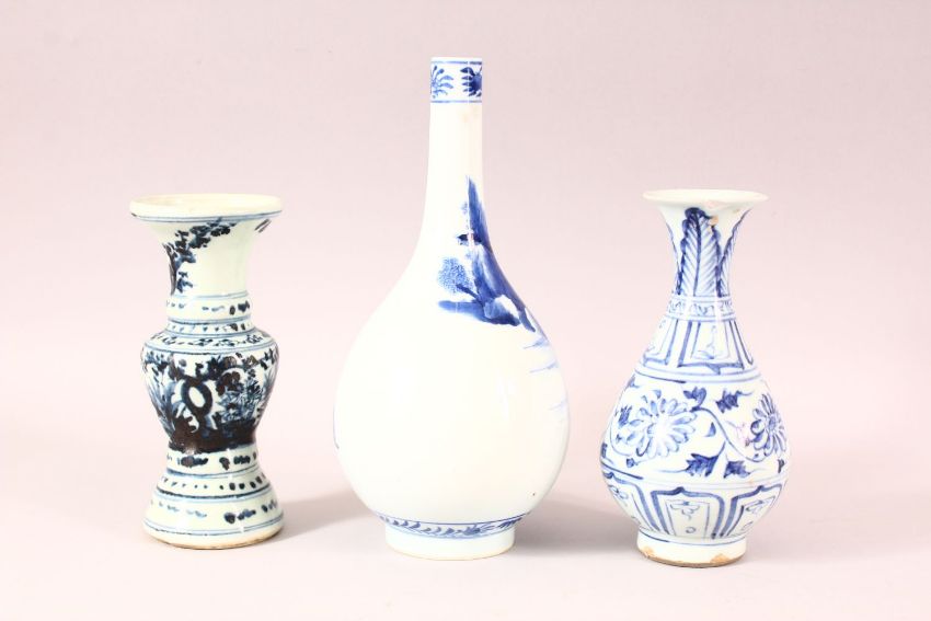 A GOOD CHINESE BLUE AND WHITE PORCELAIN VASE, depicting figure in a landscape, six character mark to base, 25.5cm high, together with two other small blue and white vases (3).