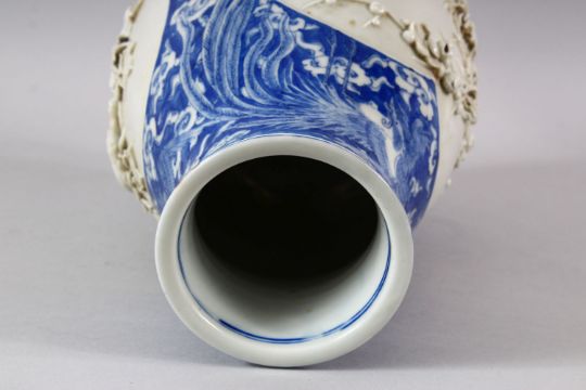 A GOOD JAPANESE MEIJI PERIOD BLUE & WHITE PORCELAIN RELIEF VASE - decorated in blue with phoenix birds and flora around two panels of monochrome relief prunus decoration, the base with a six character mark - 31cm