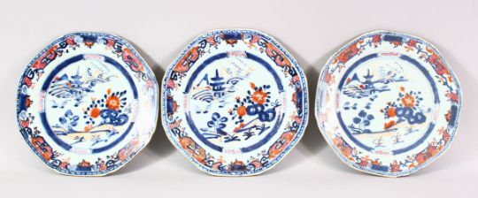 THREE 18TH / 19TH CENTURY CHINESE IMARI PORCELAIN PLATES, each decorated with landscape views, 23cm