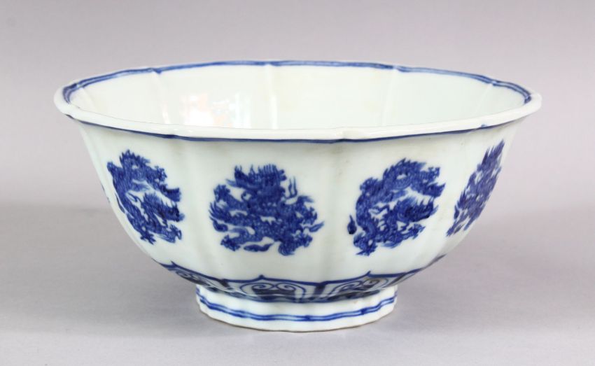 A CHINESE MING STYLE BLUE & WHITE PORCELAIN PETAL FORMED BOWL - the bowl decorated with roundel of dragons - the base with a six character mark, 21cm