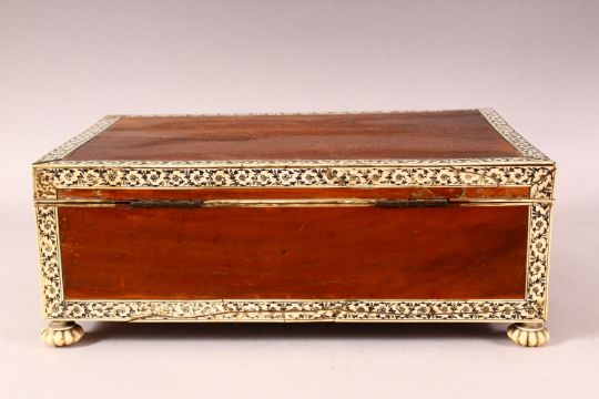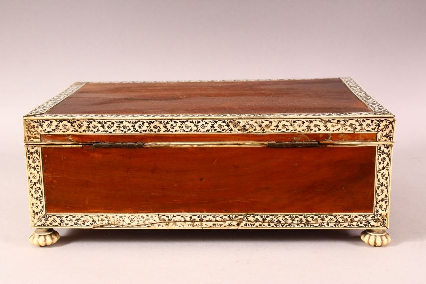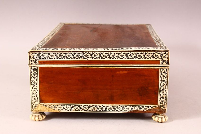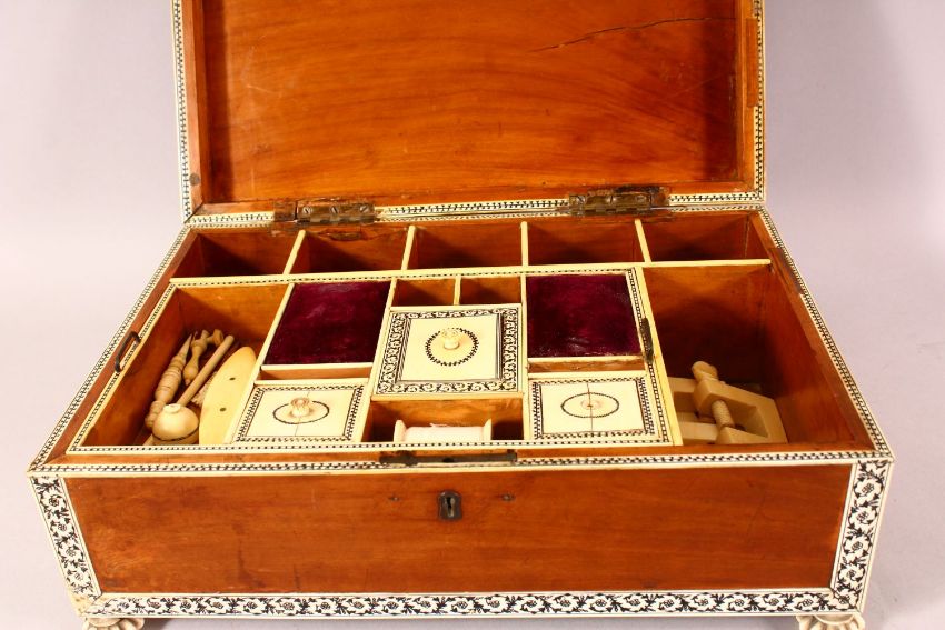 AN 18TH/19TH CENTURY VITZAKHAPATNAM SANDLEWOOD, IVORY AND PENWORK BANDED SEWING BOX, the compartmented interior with lift out tray and numerous sewing implements, 33.5cm wide.