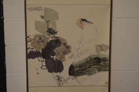 A CHINESE SCROLL PAINTING OF A STYLISED FIGURE amongst flora, image size 66cm x 66cm.
