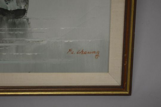 A LARGE CHINESE OIL ON CANVAS PAINTING BY F.C CHEUNG - A Water side nautical theme of Asia, signed lower right, framed 69cm x 98cm