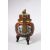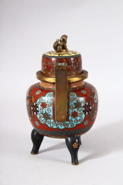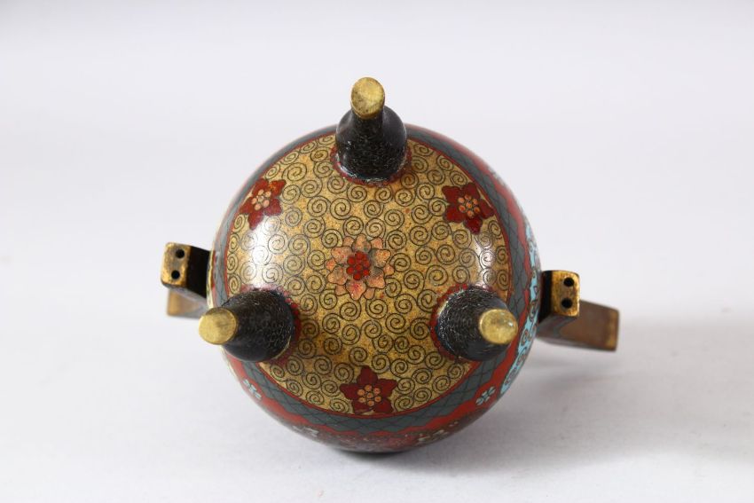 A SMALL JAPANESE CLOISONNE TWIN HANDLE KORO AND COVER, decorated with phoenix, flowers and butterflies, the cover with small kylin final, supported on three feet, 15cm high overall.