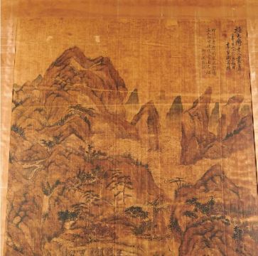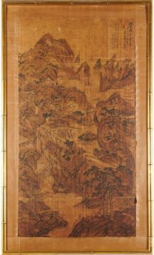 A LARGE 19TH / 20TH CENTURY CHINESE SCHOOL MOUNTAIN LANDSCAPE BY TING YONG (1835-1900) with colophon dated 1881 - ink and watercolour on silk, mounted to board and inscribed upper right, framed measuring 117cm x 70cm