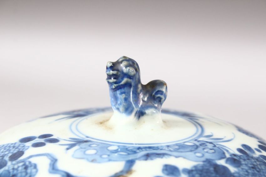 A CHINESE BLUE AND WHITE PORCELAIN ECULLE AND COVER, painted with native flora, 17.5cm diameter (handle to handle).