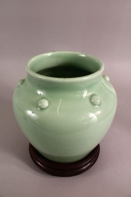 A CHINESE CELADON GLAZED VASE AND STAND, with a row of bosses to the shoulder and bearing a Qianlong mark to base, vase 20.5cm high x approx. 21cm wide, overall height on stand 24.5cm.