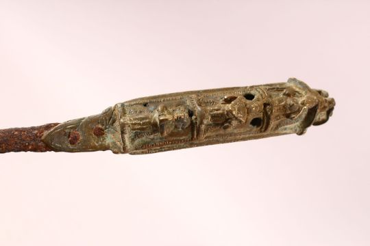 AN EARLY SOUTH INDIAN BRONZE BICHWA DAGGER HILT, with moulded figural decoration, 24cm.