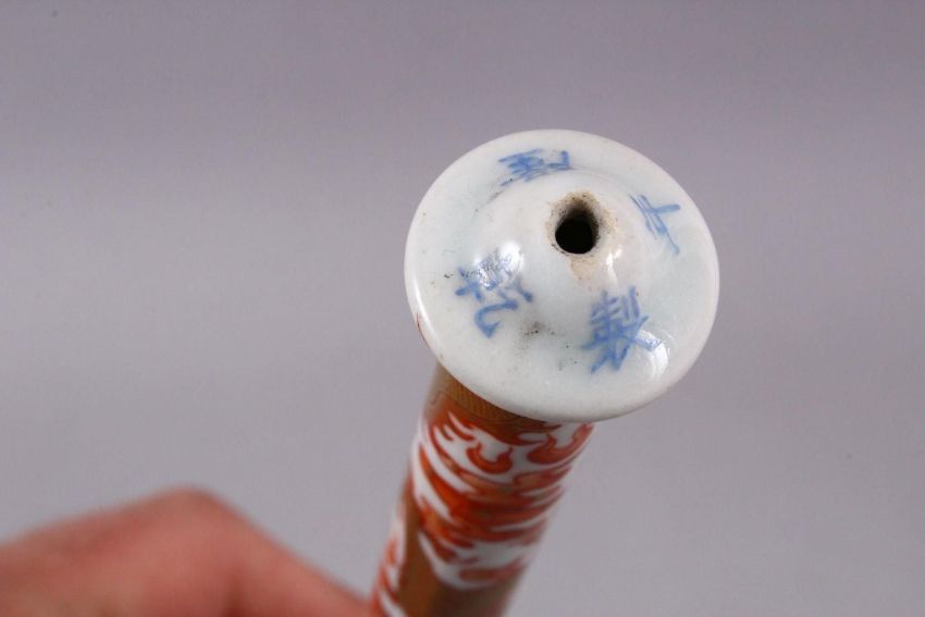 A CHINESE IRON RED & GILT DRAGON PORCELAIN PEN HOLDER OR PIPE , the body decorated with dragons and clouds, the top with a four character mark. 22cm.