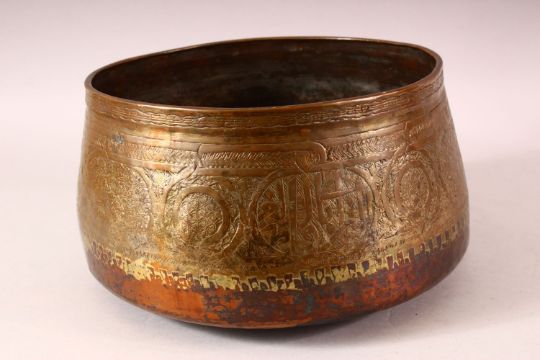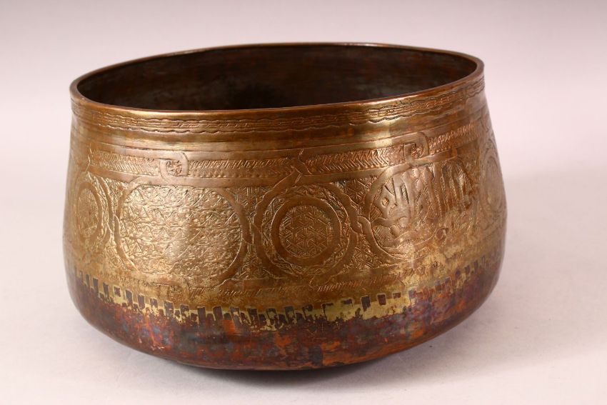 A 16TH CENTURY MAMLUK COPPER BOWL, with engraved decoration and calligraphy, 27cm diameter.