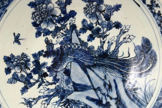 A LARGE CHINESE BLUE AND WHITE PORCELAIN CHARGER, central depicting a peacock amongst native flora, 48cm diameter.