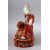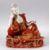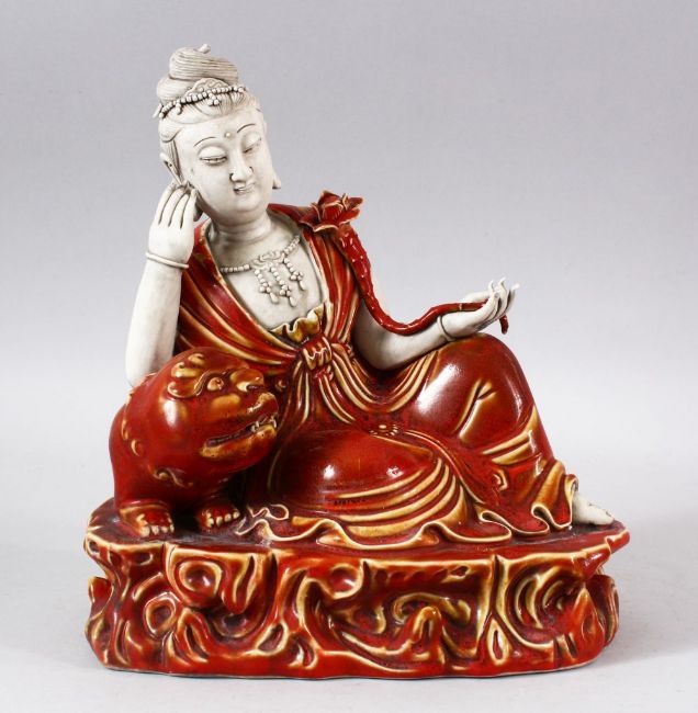A CHINESE COPPER RED GLAZED PORCELAIN FIGURE OF GUANYIN - guanyin leaning upon a lion dog - the verso with a twin impressed mark, 28cm