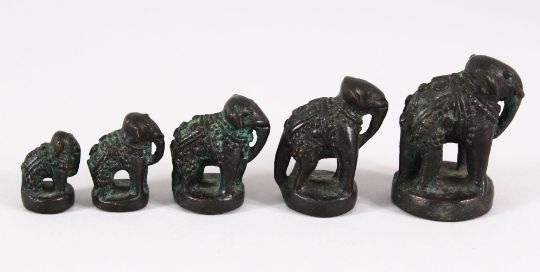 A FINE SET OF 19TH CENTURY CHINESE TIBET ELEPHANT BRONZE OPIUM WEIGHTS - 5 of graduating size - 2.5cm up to 5cm