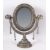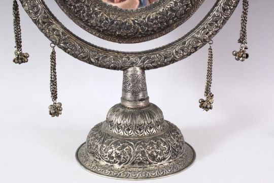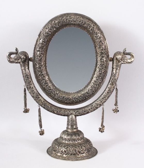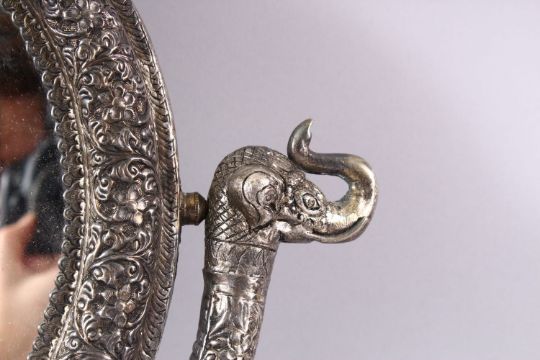 A GOOD INDIAN EMBOSSED WHITE METAL MORROR ON STAND - the mirror with twin elephant heads eitherside of the oval mirror, the glass encapsulated with pressed floral metal, with hanging chain decor - 47cm