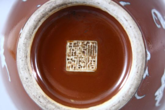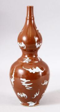 A CHINESE BROWN GLAZED DOUBLE GOURD PORCELAIN BAT VASE - decorated with many bats upon a cafe au lait glaze, the base with an incised seal mark. 29cm