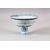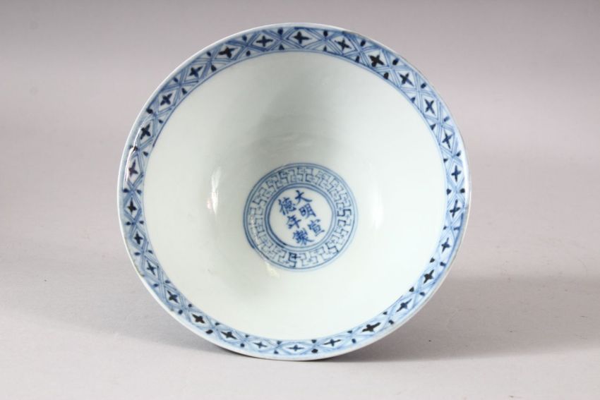 A CHINESE MING STYLE BLUE & WHITE PORCELAIN STEM BOWL - FOR ISLAMIC MARKET - with archaic script decoration, the interior of the bowl with a six character mark, 18cm