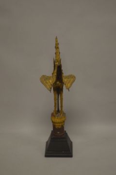 A 19TH CENTURY BUDDHIST GILT BRONZE FIGURE OF A HONGSA BIRD, inlaid with mirrored pieces, the mouth fitted with a hanging bell, fitted to a wooden base, 84cm high.