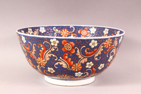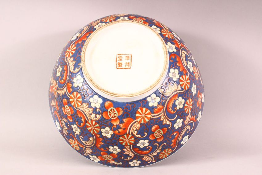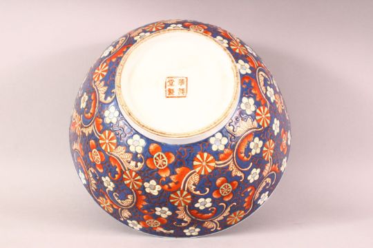 A CHINESE BLUE GROUND PORCELAIN BOWL, incised and painted with flower head design, mark to base, 30cm diameter.